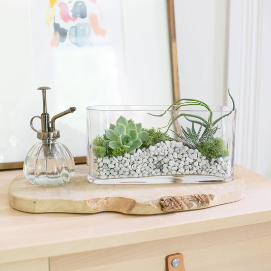 Choosing the right container is an important first step in creating a DIY terrarium. Not sure which terrarium container is right for you? Start with our DIY Terrarium Kit that features a glass vessel and lid. The kit also includes hydro stones, soil, and moss to plant succulents or little plants. This kit will get you on the right track when building your very own DIY terrarium.