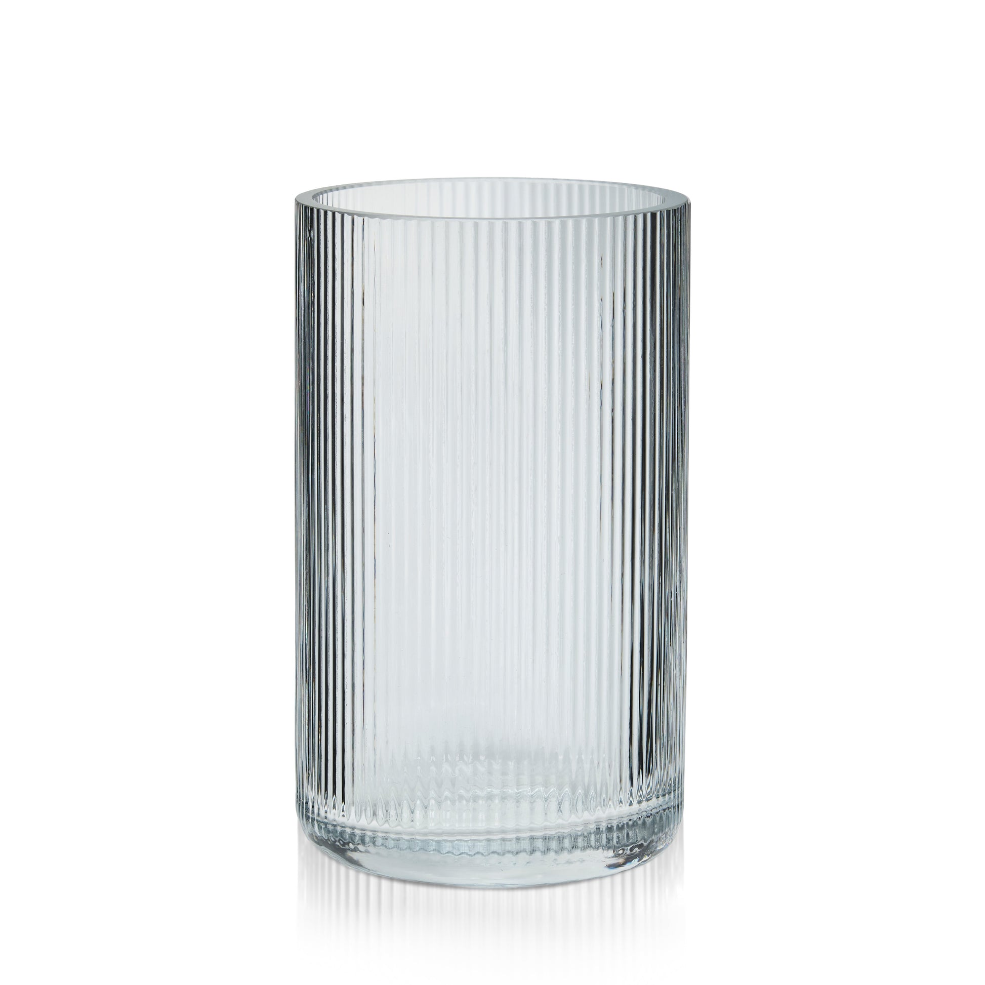 A classic glass cylinder enhanced with subtle ribbing that adds depth and texture while keeping the focus on the flowers. The clean, straight-sided silhouette offers everyday versatility, working beautifully for mixed arrangements, centerpieces, and seasonal florals. Modern yet timeless, this vase provides visual interest without overpowering the design, making it an easy staple for retail, events, and everyday use.