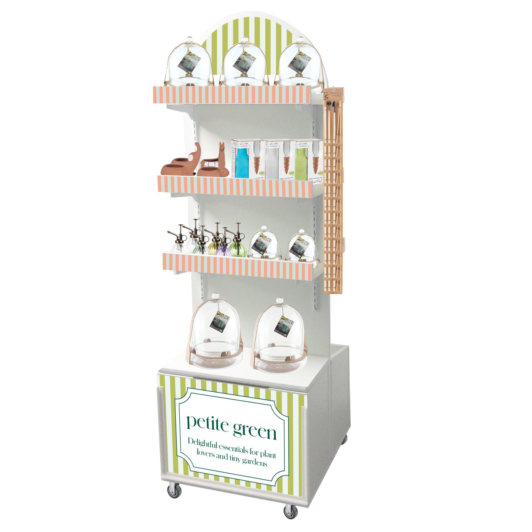 The That Flower Feeling™ side is built to inspire spontaneous floral purchases with bold colors, impactful signage, and functional containers. Flip to the Petite Green™ side for a curated gift selection filled with charming plant tools, cloches, and accessories that speak to plant lovers and trend-forward shoppers.
